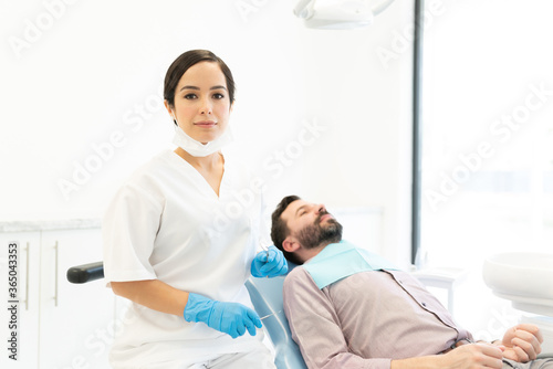 Obraz premium Caucasian Dentist By Patient On Chair