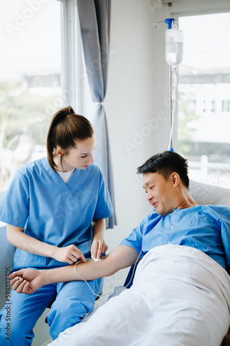 © Nuttapong punna, Fototapeta premium Caucasian doctor smiling take care of a young patient in hospital. Friendly nurse or therapeutic treat client Professional medical service concept.
