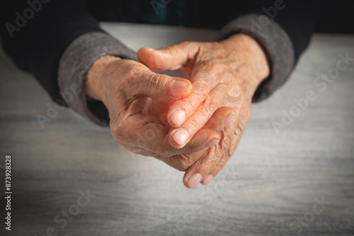 © andranik123, Fototapeta premium Caucasian elderly woman suffering from finger pain.