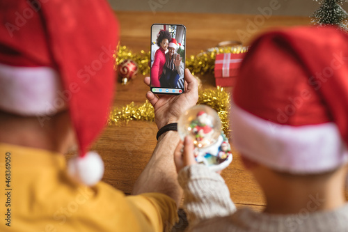 © vectorfusionart, Fototapeta premium Caucasian father and son in santa hats making smartphone christmas video call with diverse friends