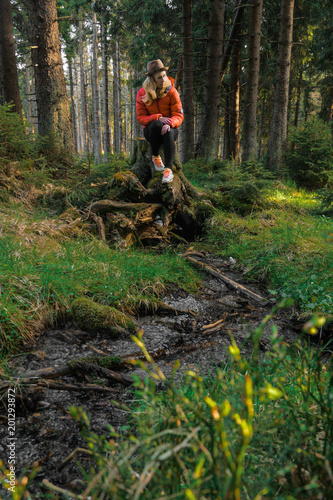 © listercz, Naklejka premium caucasian female hiker standing on a dirt road with big backpack