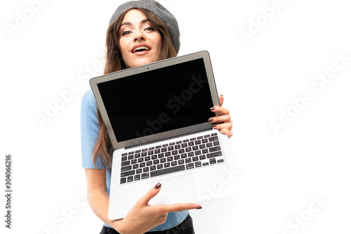 Naklejka premium Caucasian female with laptop and smiles, picture isolated on white background