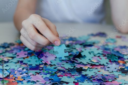 © Екатерина Говорина, Fototapeta premium Caucasian girl collects puzzles on the table.