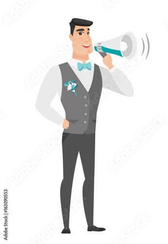 Fototapeta premium Caucasian groom talking into loudspeaker.