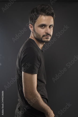 © bilalizaddin, Fototapeta premium Caucasian guy wearing black T-shirt in studio