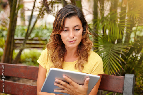 © pablocalvog, Fototapeta premium Caucasian lady browsing internet on tablet