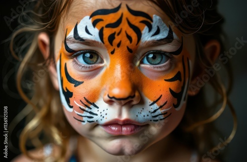© kilimni, Naklejka premium Caucasian little girl with tiger animal face painting, close-up. Events and entertainment for children. Kid's birthday party or pastime on vacation