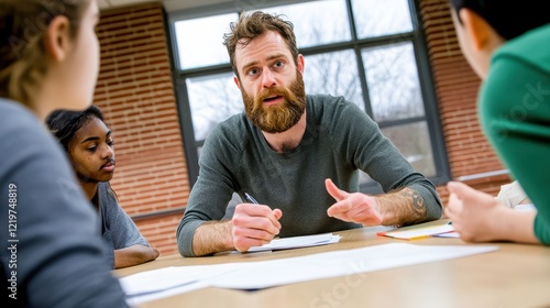 © Riko, Fototapeta premium Caucasian male adult leading group discussion with young diverse participants