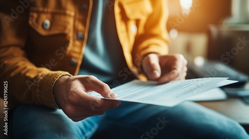 Obraz premium Caucasian male adult reading important document in casual setting