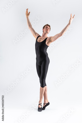 © danmorgan12, Obraz premium Caucasian Male Ballet Dancer Flexible Athletic Man Posing in Black Tights in Ballanced Dance Pose