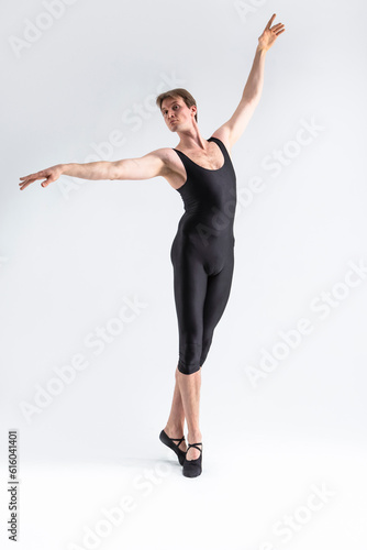 © danmorgan12, Fototapeta premium Caucasian Male Ballet Dancer Flexible Athletic Man Posing in Black Tights in Ballanced Dance Pose