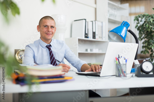 © JackF, Obraz premium Caucasian male office worker sitting in his workplace and looking in camera.