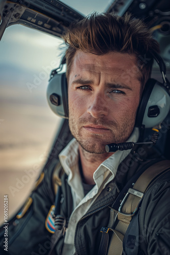 © S photographer, Obraz premium Caucasian male pilot is piloting a helicopter, in the cockpit.