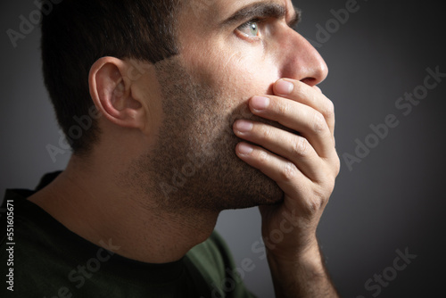 © andranik123, Obraz premium Caucasian man covering his mouth with hand. Secret