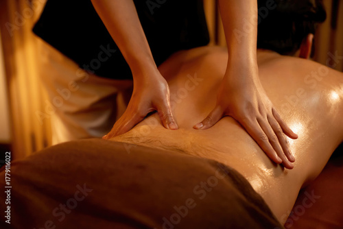 © InfiniteFlow, Obraz premium Caucasian man customer enjoying relaxing anti-stress spa massage and pampering with beauty skin recreation leisure in warm candle lighting ambient salon spa at luxury resort or hotel. Quiescent