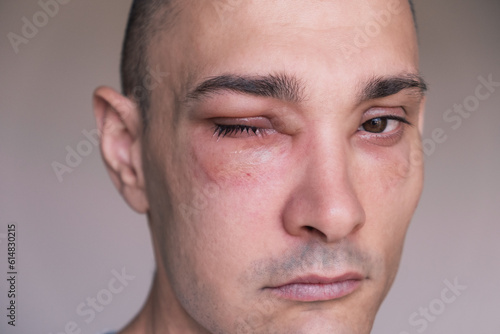 © Iryna, Obraz premium Caucasian man has angioedema around the eyes caused by allergic reaction to agents such as insect bites, foods, or medications. Swollen face, close up.