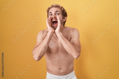 Fototapeta premium Caucasian man standing shirtless wearing sun screen shouting angry out loud with hands over mouth