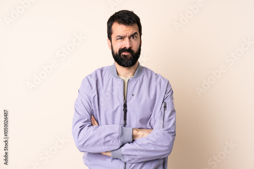 © luismolinero, Fototapeta premium Caucasian man with beard wearing a jacket over isolated background feeling upset