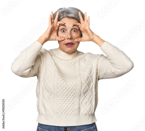 © Asier, Naklejka premium Caucasian mid-age female on studio background keeping eyes opened to find a success opportunity.