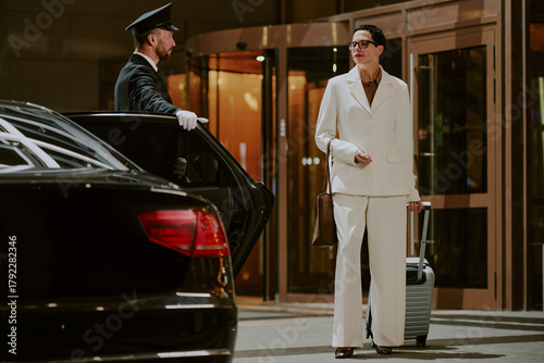 © AnnaStills, Fototapeta premium Caucasian middle aged woman standing outside hotel entrance holding suitcase and handbag while Black man chauffeur in uniform opening car door, both engaging in business travel scenario
