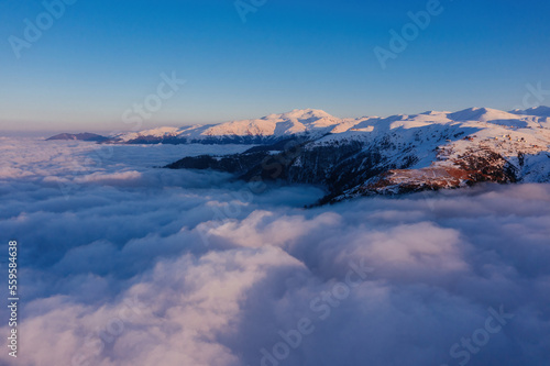Naklejka premium Caucasian mountains above the clouds at the sunset