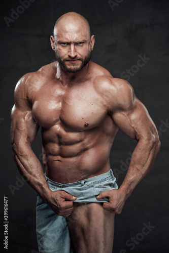 © Fxquadro, Fototapeta premium Caucasian muscular man with hairless head and naked torso pulls his shorts showing his muscular leg looking at camera with serious face in dark background.