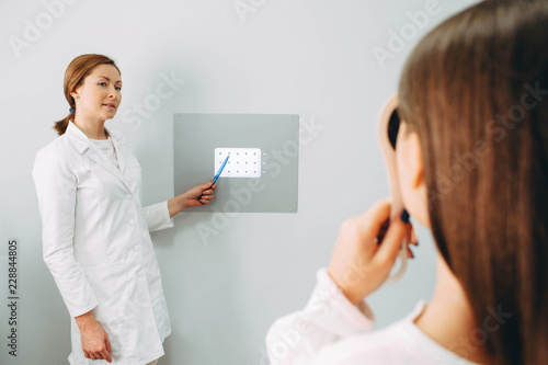 Fototapeta premium Caucasian optometrist checking girl's eyesight, pointing into special eye chart for checking vision.
