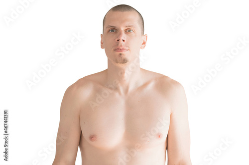 Fototapeta premium Caucasian shirtless young guy with small beard stands and looking forward isolated on white background. Bachelor. Single. Sport. Body care. Skin care