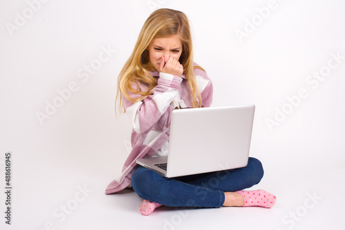 © Jihan, Fototapeta premium caucasian teen girl sitting with laptop in lotus position on white background , holding his nose because of a bad smell.