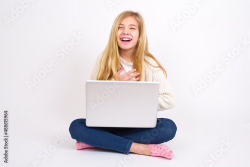 © Jihan, Fototapeta premium caucasian teen girl sitting with laptop in lotus position on white background keeps hands crossed, laughs out loud at good joke, wears casual clothes.