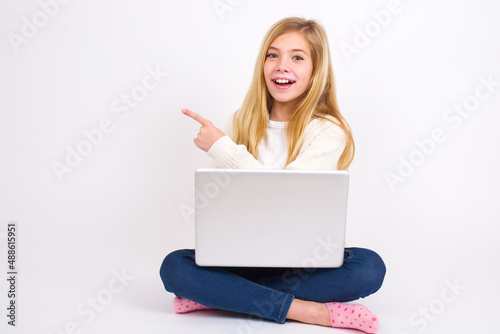 © Jihan, Naklejka premium caucasian teen girl sitting with laptop in lotus position on white background pointing away and smiling to you. Look over there!
