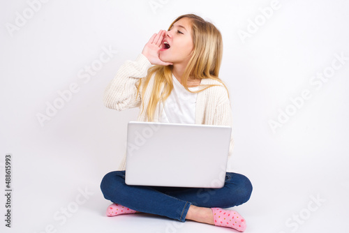 © Jihan, Fototapeta premium caucasian teen girl sitting with laptop in lotus position on white background profile view, looking happy and excited, shouting and calling to copy space.