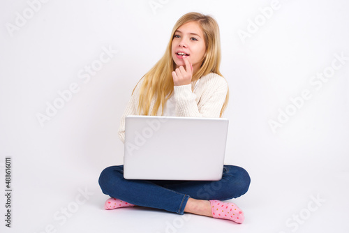 © Jihan, Fototapeta premium caucasian teen girl sitting with laptop in lotus position on white background with thoughtful expression, looks to the camera, keeps hand near face, bitting a finger thinks about something pleasant.