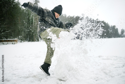 © Seventyfour, Fototapeta premium Caucasian teenage boy kicking snow outdoors, wearing winter hat and gloves, standing on snowy field with forest in background, energetic movement sending snow flying