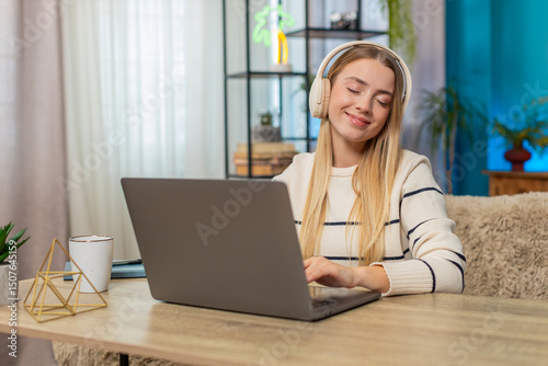 Fototapeta premium Caucasian woman at home on table wearing wireless headphones, typing on laptop, listening music, remote work, feeling calm and motivated. Girl appears relaxed, happy, enjoying creativity, smiling