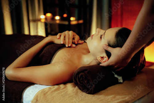 © InfiniteFlow, Fototapeta premium Caucasian woman enjoying relaxing anti-stress head massage and pampering facial beauty skin recreation leisure in warm candle lighting ambient salon spa in luxury resort or hotel. Quiescent