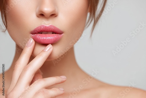 Obraz premium Caucasian Woman Gently Touching Her Lips in a Relaxing Bathroom Setting Focused on Beauty and Self-Care