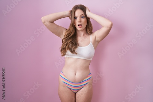 © Krakenimages.com, Fototapeta premium Caucasian woman wearing lingerie over pink background crazy and scared with hands on head, afraid and surprised of shock with open mouth