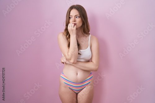 © Krakenimages.com, Fototapeta premium Caucasian woman wearing lingerie over pink background looking stressed and nervous with hands on mouth biting nails. anxiety problem.