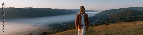 © Andrii Zastrozhnov, Naklejka premium Caucasian young adult male enjoying scenic mountain view at sunrise