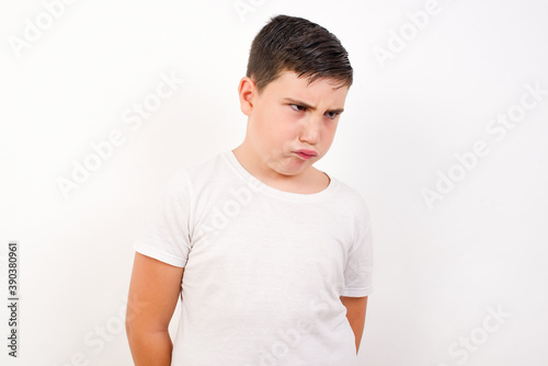 © Jihan, Obraz premium Caucasian young boy standing against white background with snobbish expression curving lips and raising eyebrows, looking with doubtful and skeptical expression, suspect and doubt.