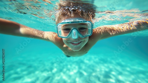 © O, Fototapeta premium Caucasian young boy swimming underwater with goggles in clear blue pool