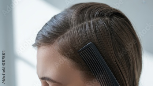 Fototapeta premium Caucasian young female with brown hair parted and combed