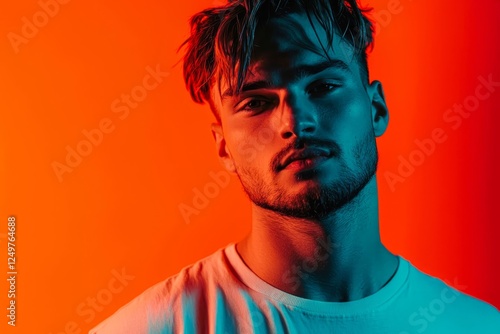 © Hunman, Fototapeta premium Caucasian young man's portrait on gradient orange studio background in neon light.