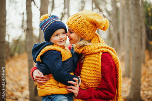 Obraz premium Caucasian young mother hugging talking to cute adorable toddler boy son in autumn fall park outdoor with yellow orange red tree leaves. Happy family. Autumnal seasonal activity outdoor.