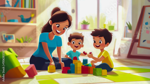 © Atmospheric stock, Fototapeta premium Caucasian young woman and children building with colorful blocks in bright playroom