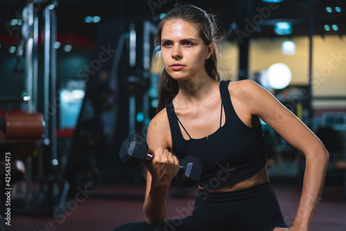 Fototapeta premium Caucasian young woman in sportswear lifting dumbbell in fitness club or gym.