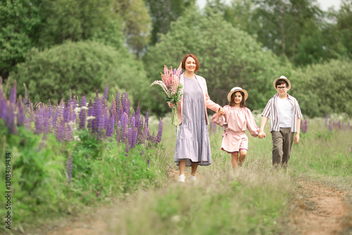Fototapeta premium Caucasian young woman with children walking in lavender field holding flowers