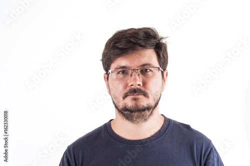 Fototapeta premium Caucasion man with glasses, beard and Disheveled hair look into camera