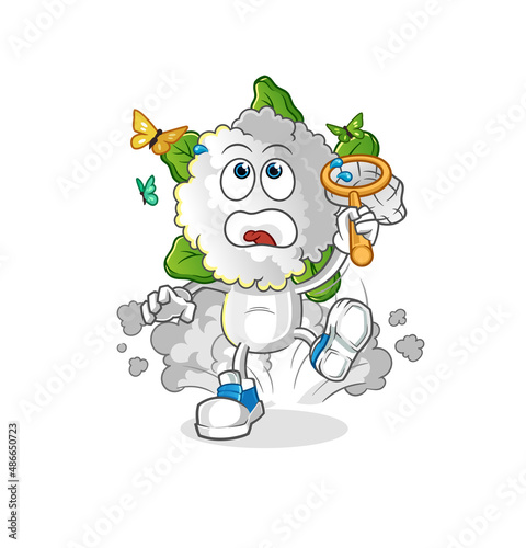 © dataimasu, Naklejka premium cauliflower head cartoon catch butterfly illustration. character vector